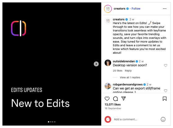 Midway through the month, Instagram released some more updates to its separate video editing app ‘Edits’, in order to make the Reels creation process even more intuitive and efficient.
