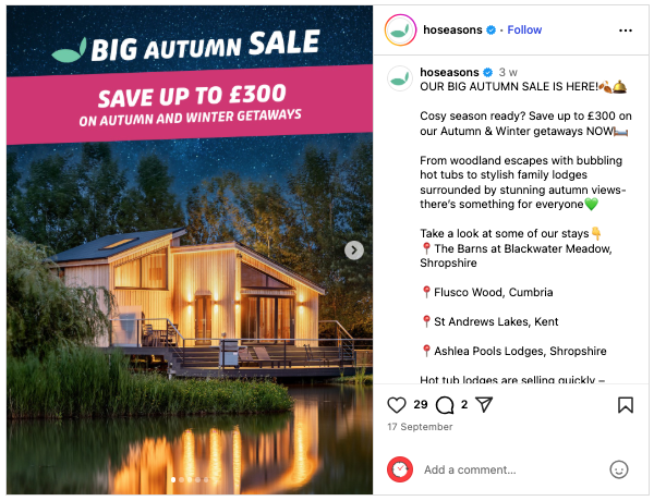 This might seem like an obvious one - but if you’re running a special offer on your website or are having an exclusive sale, don’t forget to shout about it on social media! 76% of consumers find coupons through social media, and 83% of people say they are either “somewhat likely” or “very likely” to click an ad offering a promotion online.